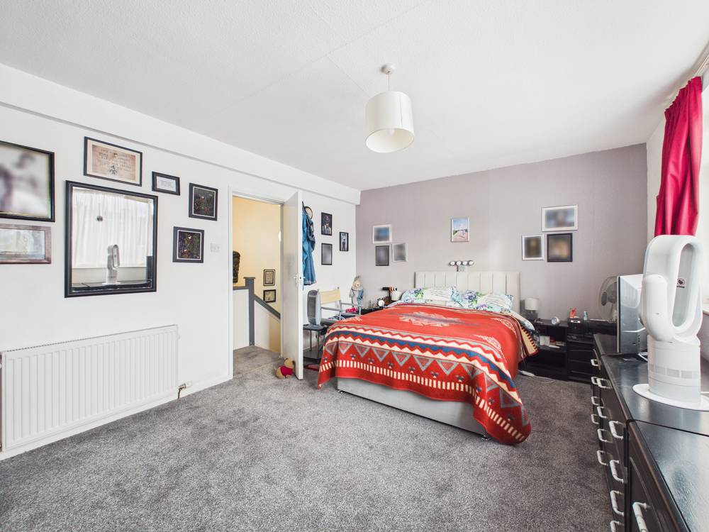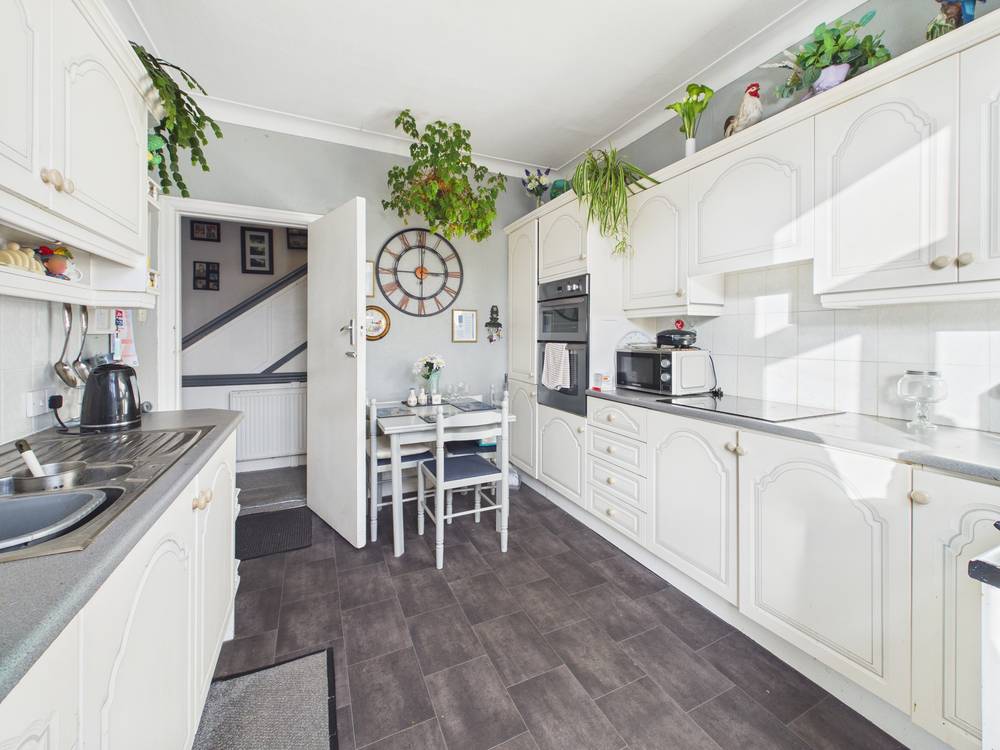 First Floor: Front lounge 5.1m x 4.2m; Bathroom 2m x 3.5m includes bath with shower over, toilet, wash hand basin; Kitchen 3m x 3.6m fitted wall and base units, hob, double oven; Access from roof garden and stair case to rear.
